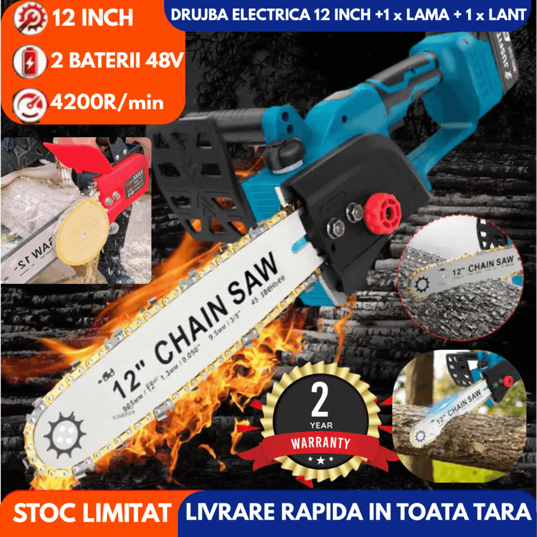 Drujba Electrica Cu 1 x Lama 31 cm (12 INCH), 1 x Lant, 2 x Acumulator 48V